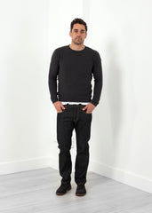 This comfortable knit sweater delights the eye in a diamond pattern as well as the body. Slim fitting silhouette with movement. Homecore. Crew neckline. Color Anthracite. 100% Cotton. Made in Portugal. Jacob is wearing a Medium.