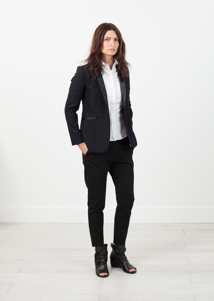 Black tie formal blazer crafted exclusively for the feminine form. Princess seaming emanates a classic silhouette for a tailored beauty. Single button front closure. Front waist pockets. Fully lined. Harvey Faircloth. Color Black. 100% Wool, 65% Acetate, 29% Polyamide, 6% Elastane. Lining, 100% Polyester. Made in U.S.A. Lana is wearing a size 2.